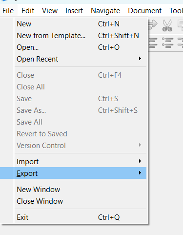 - 论文撰写 – 使用 Lyx 2.4.x 版本 + latex 最新版 + IOP 模板,如果以使用高版本的 Lyx 编写文档,可以用高版本自带的导出功能将文档导出成兼容 2.4.x 版本的形式,具体方法见下图